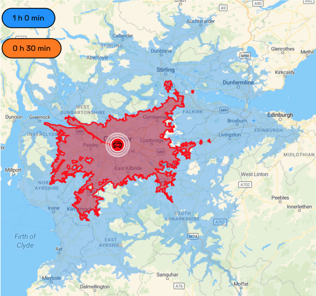 Travel is free within the red zone. We add a £40 travel charge in the extended area marked in blue in the map.
